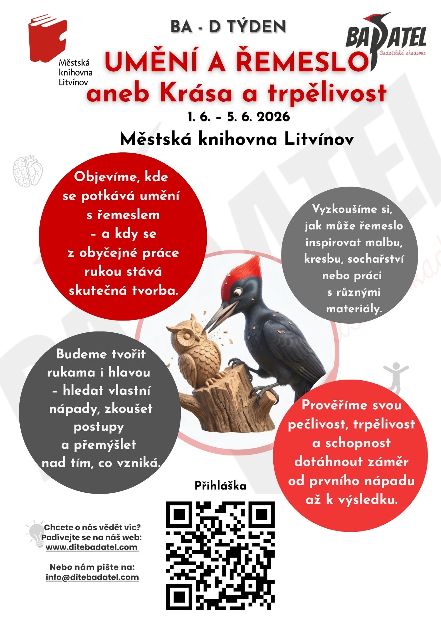 Zveme děti z 1. stupně ZŠ na červnový BA-D TÝDEN v Litvínově, který připravujeme ve spolupráci s Městskou knihovnou Litvínov. Tentokrát se společně vydáme za tématem Umění a řemeslo aneb Krása a trpělivost.