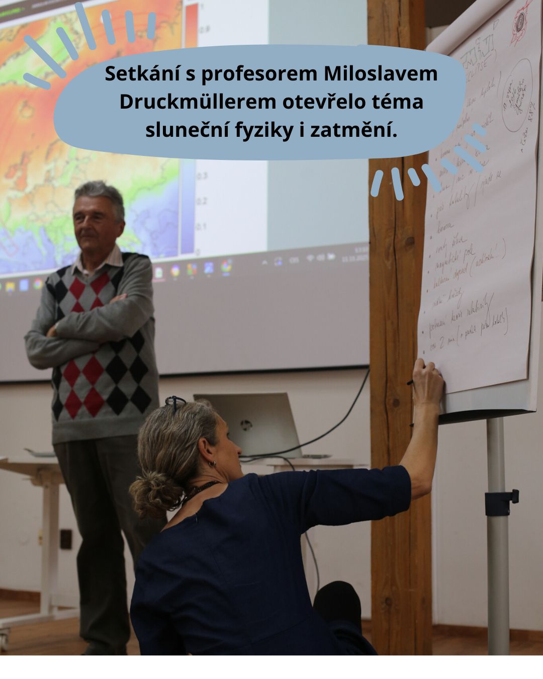 V úterý nás navštívil matematik, pan profesor Miloslav Druckmüller, který nám odhalil novou tvář Slunce. Byl to on, kdo znovu rozpoutal zájem mezinárodních vědců o studium Slunce prostřednictvím úplných zatmění, díky kterým zkoumá sluneční koronu a magnetické pole Slunce. To mimo jiné ovlivňuje i magnetické pole Země a může mít vliv na činnost našich elektronických přístrojů.