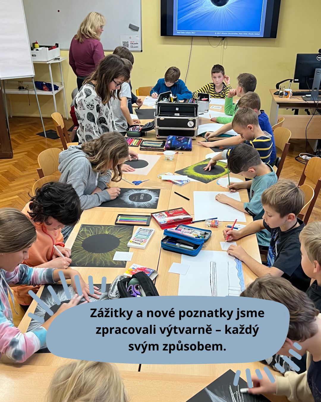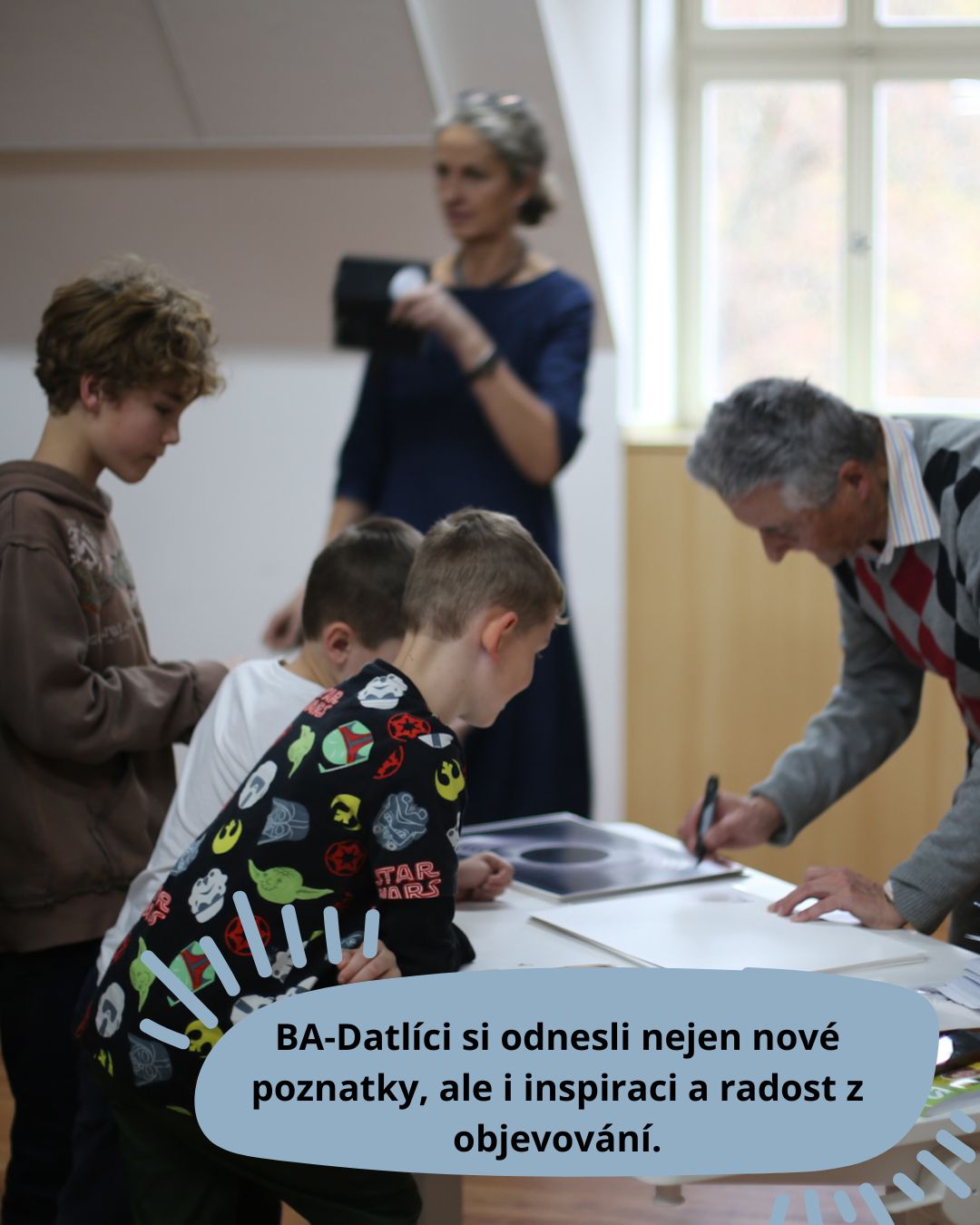 Zhlédli jsme o jeho práci fascinující dokument Helios – a i když nebyl úplně jednoduchý, všichni BA-Datlíci udrželi pozornost při jeho sledování, následné diskuzi i samotné přednášce pana profesora. Právě on nám prozradil, že skoro veškerá energie, kterou používáme, je ze Slunce – i ta fosilní, větrná nebo vodní. Za tím vším stojí Slunce. Jen atomová energie má jiný zdroj, který pochází z prvků jiných, velmi vzdálených hvězd.