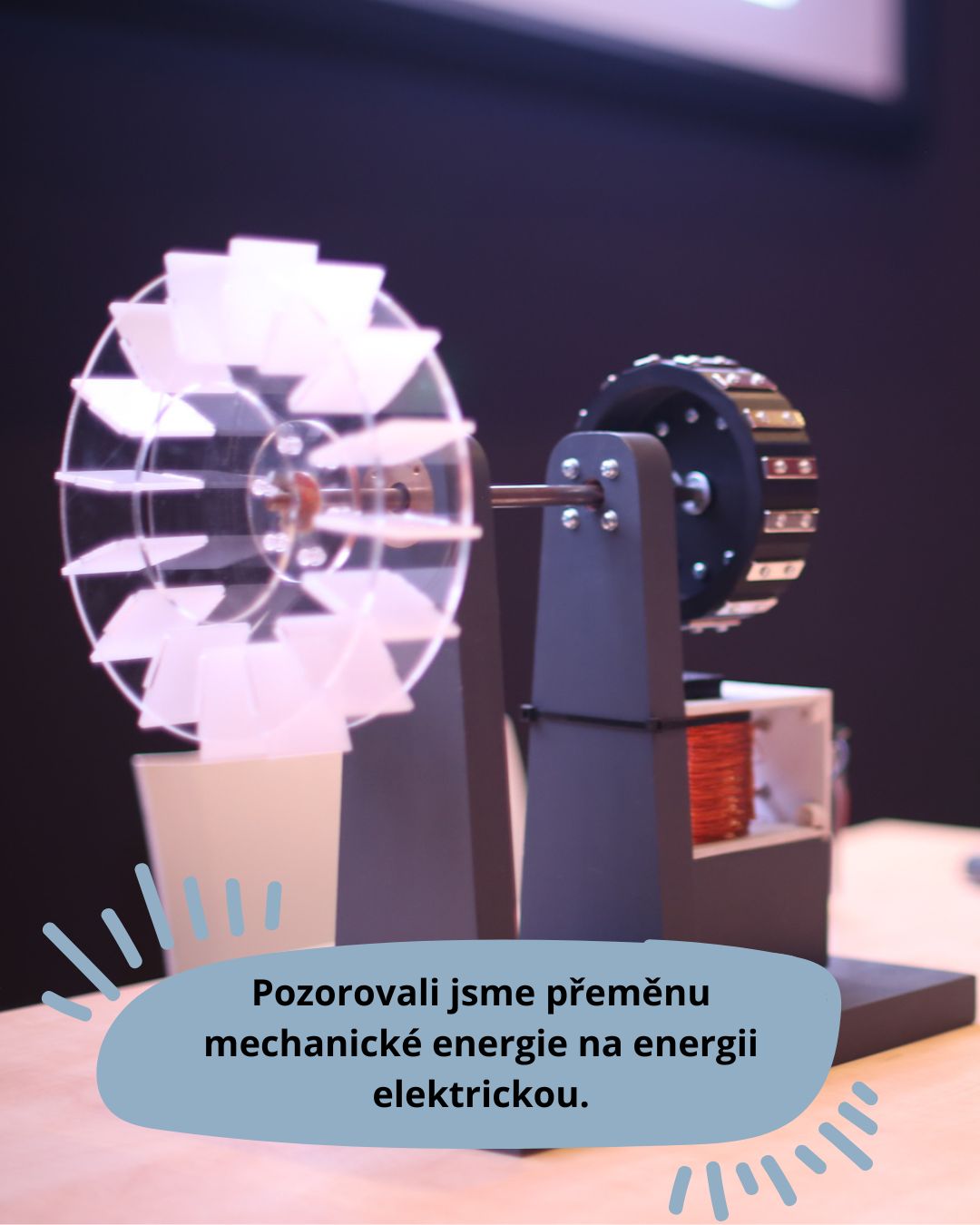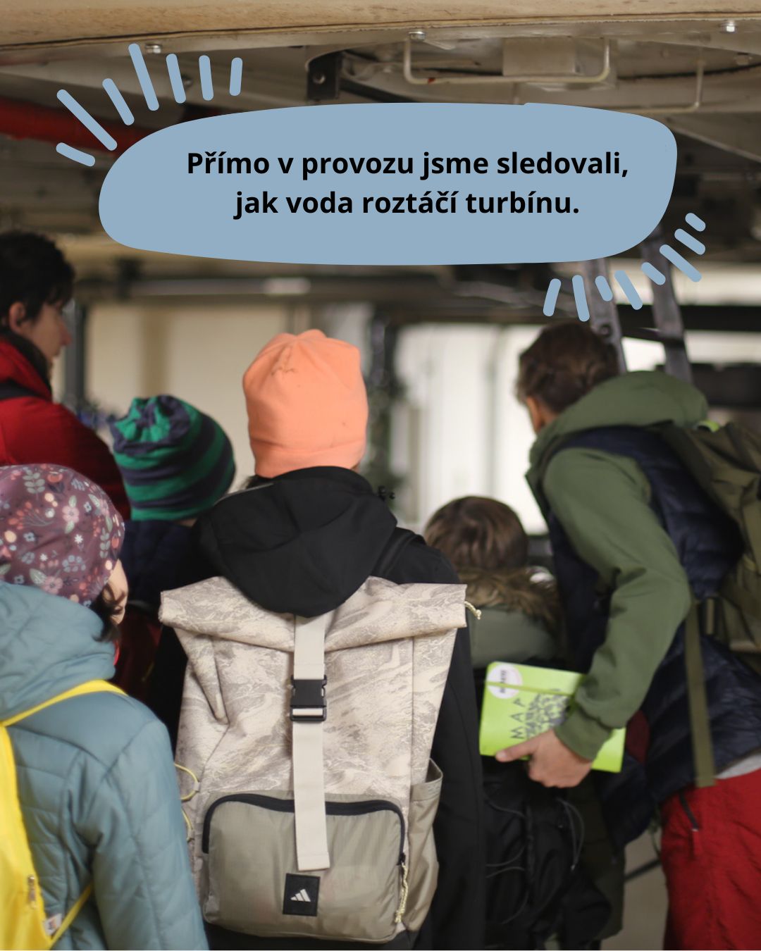 Což se nám hodilo právě ve čtvrtek, kdy jsme navštívili vodní elektrárnu Střekov (Masarykovo zdymadlo). Tady byl pro nás sice odborný výklad poněkud složitý, ale zase jsme se podívali přímo do provozu. Hurá! Viděli jsme část Kaplanovy turbíny poháněné vodou a dozvěděli se, jak se energie vody při pohonu turbíny mění z mechanické (otáčení turbíny) na elektrickou. To je princip celé řady elektráren – ať už turbínu roztáčí voda, vítr nebo pára (u tepelných elektráren).