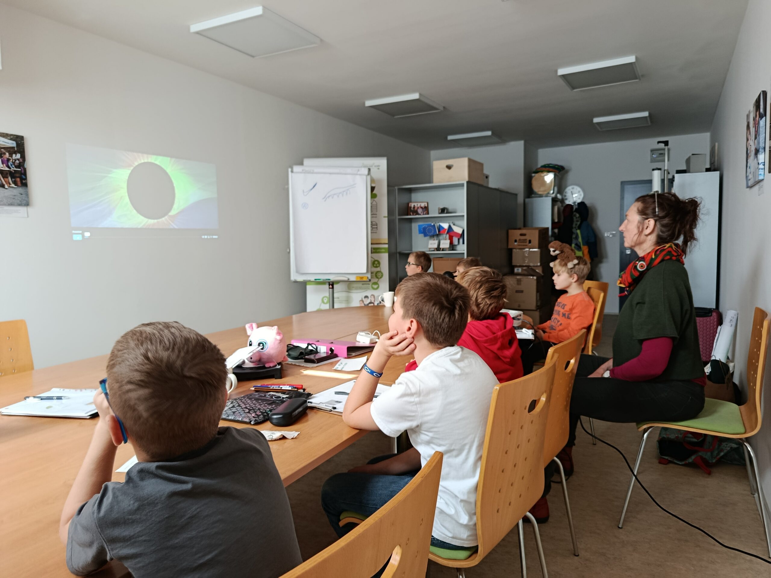 Po obědě jsme na procházce čerpali energii ze slunce a z pohybu. Vyzkoušeli jsme si také v terénu, jak k tomu úplnému zatmění slunce vlastně dojde. V principu nám to bylo jasné, ale jemné nuance, jako například proč není úplné zatmění každý měsíc, ale jen jednou za mnoho let, jsme museli doladit ještě po procházce, na papírovém modelu u stolu.