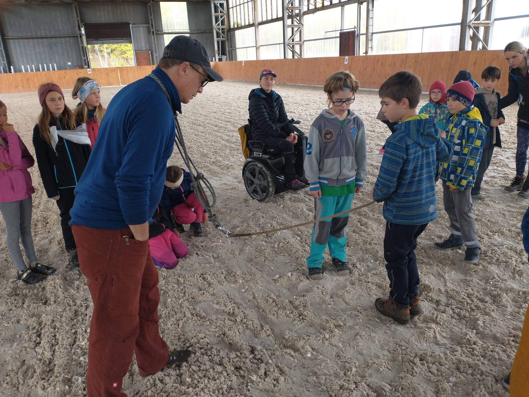 Následovalo odhalování principů práce s koněm. Michal se nám proměnil v koně a naším